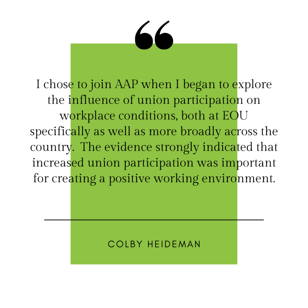 AAP is populated by faculty who are invested in ensuring quality instruction by fighting for equitable compensation and working conditions. AAP plays an important role in ensuring that the faculty expertise and experience is taken seriously in institutional decision-making and that faculty are defended from hostile and arbitrary workplace practices. AAP also partners with SEIU representation of classified staff to fight for similar goals on their behalf. These actions make possible hiring and retaining exceptional educators who engage students with learning and support their success.